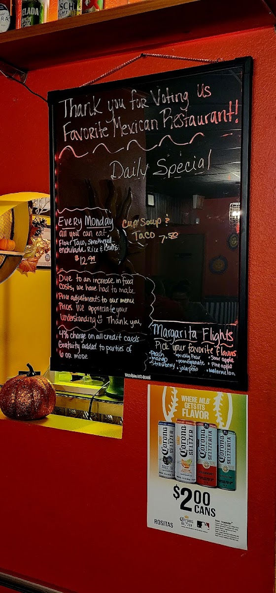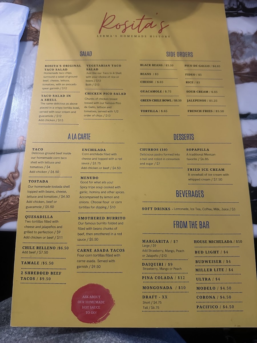 Customer reviews echo the warmth of Rosita's atmosphere and the speedy service. Patrons love the unique margarita flights, especially the standout jalapeno flavor. With options like chimichangas and tacos, there's no shortage of delicious offerings. Rosita's not only delights the palate but also ensures a safe dining environment with attentive staff. A visit here is not just a meal—it's an experience, and it's definitely worth the stop!